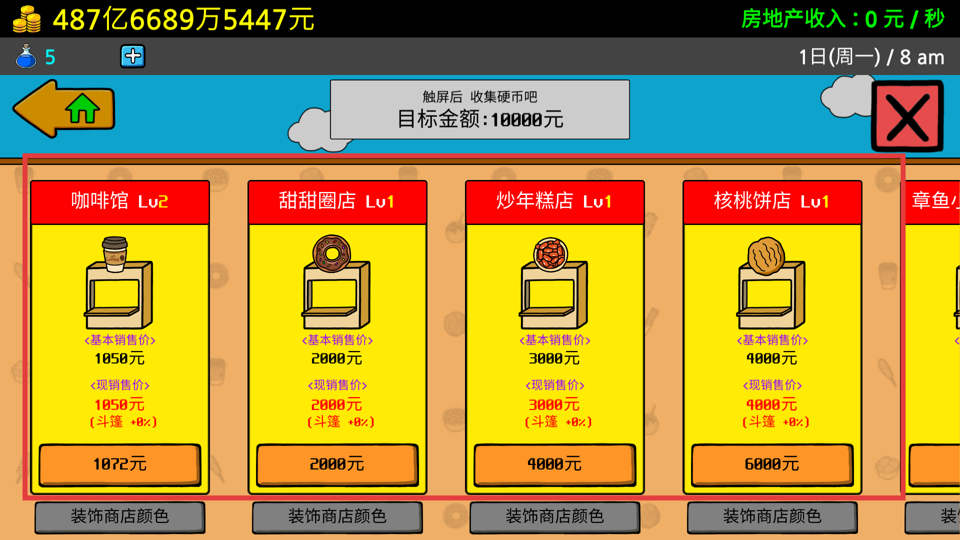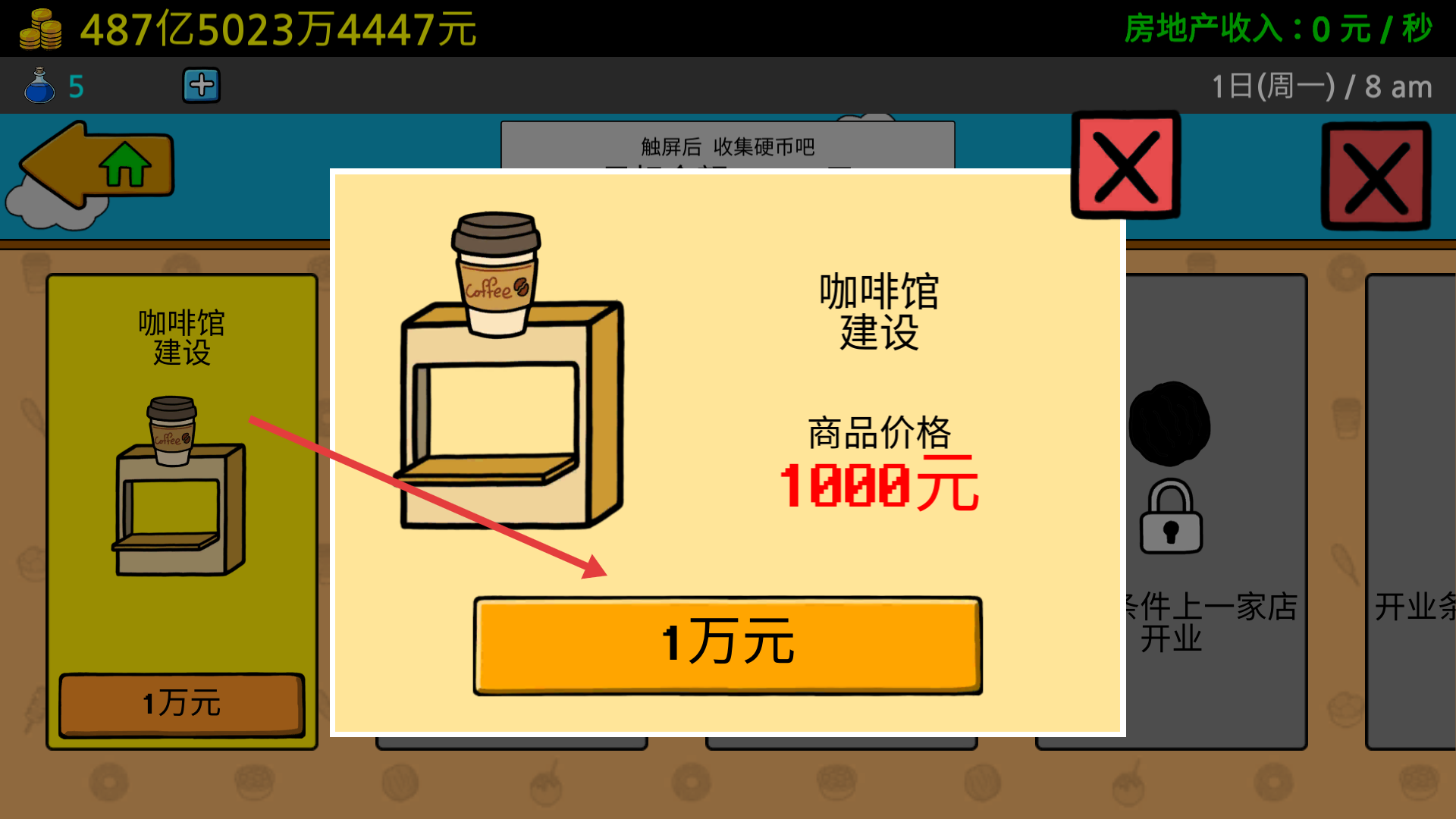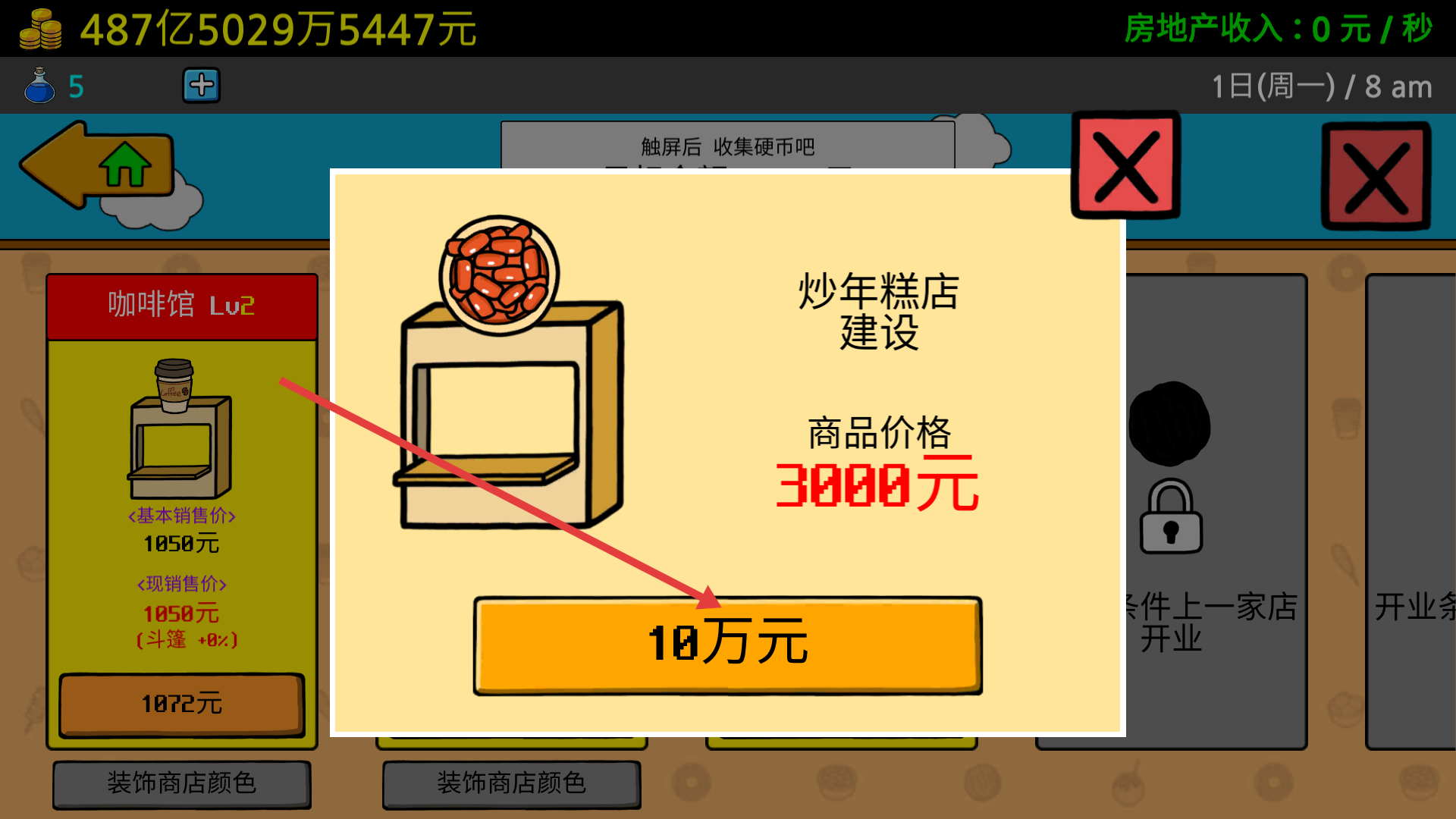 2、花费1万元建设咖啡馆,商品价格1000元,通过开设店铺增加收入来源,逐步扩大商业版图。