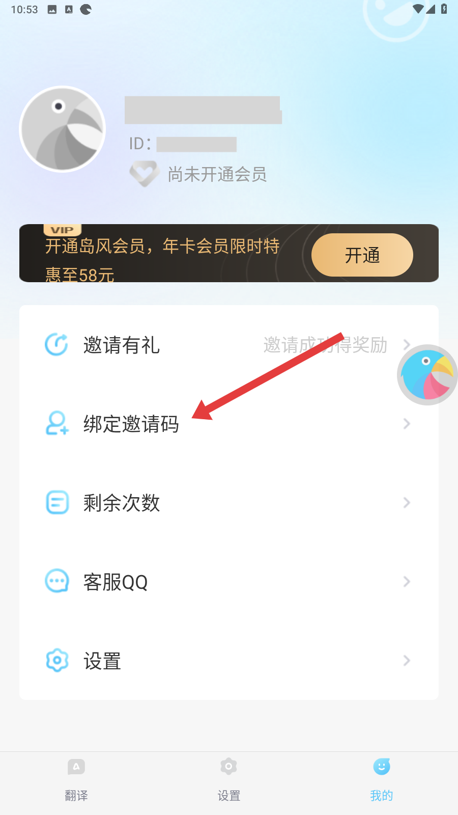 2、在个人中心页面,找到【绑定邀请码】选项并点击,进入绑定邀请码的专属页面啦。