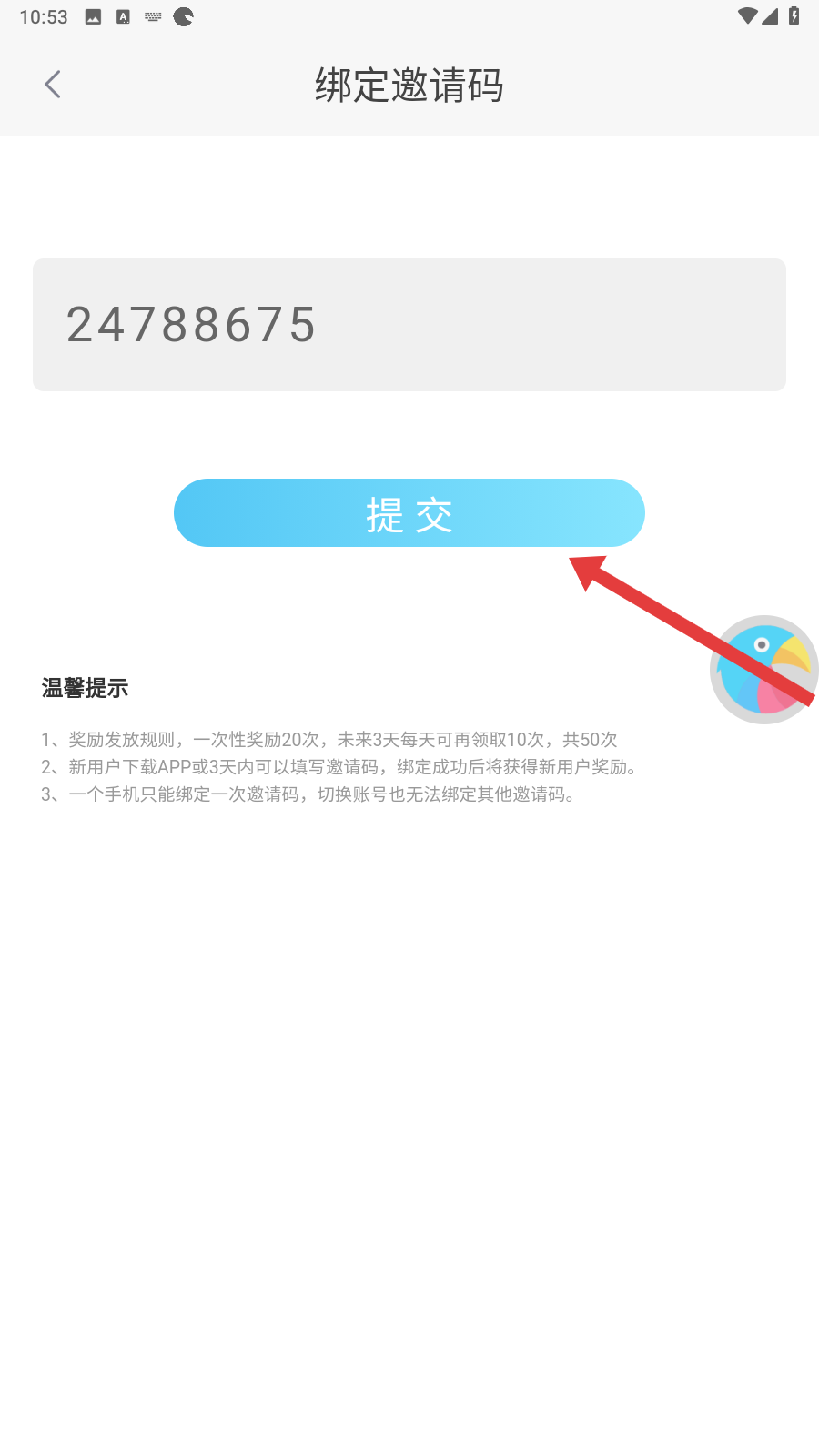 4、输入邀请码【24788675】后,点击【提交】按钮,即可完成邀请码绑定,领取相应奖励啦。