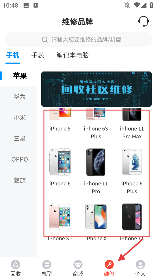 1、打开APP,点击底部【维修】,进入维修品牌选择界面,选择要维修的设备。