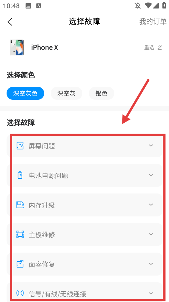 2、进入选择故障界面,在故障类型中选择对应的问题。