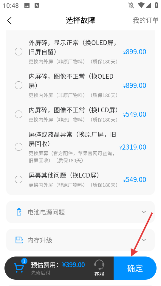 3、选择具体的故障情况,确认预估费用后,点击【确定】。