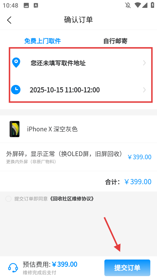4、进入确认订单界面,填写取件地址和时间,勾选同意协议后点击【提交订单】。