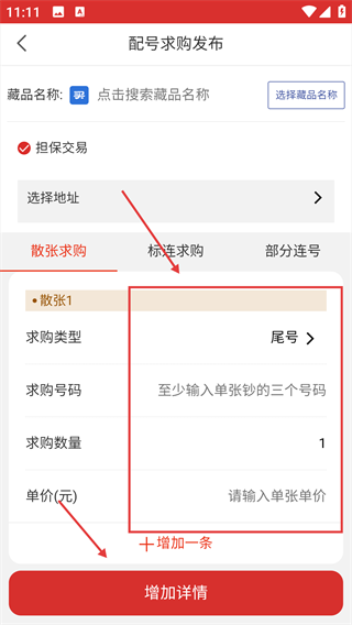 4、依次填写藏品名称、求购号码、求购数量、单价等信息,完成后即可发布流程。