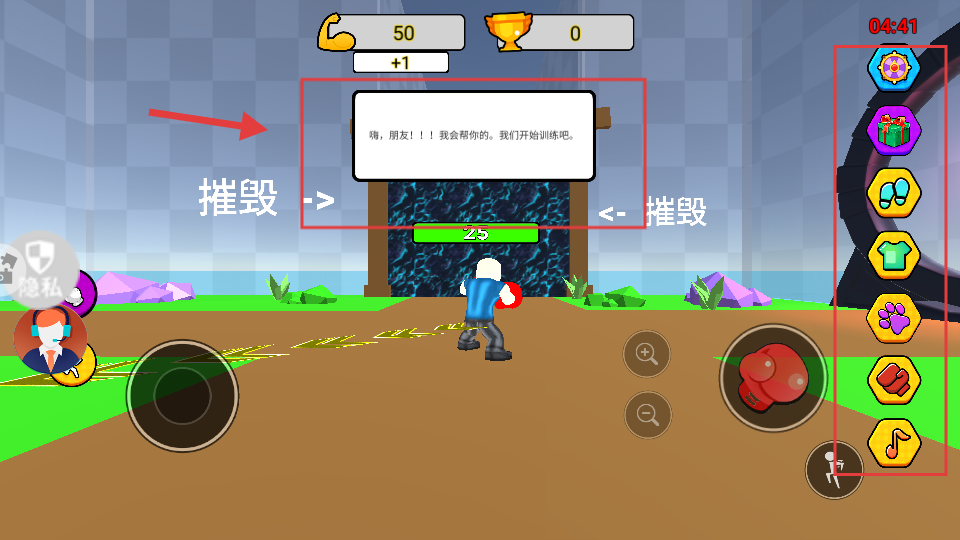 1、游戏开始有引导提示,跟着提示点击中间区域开始训练,注意初始【力量-50】和两侧【摧毁】按钮。