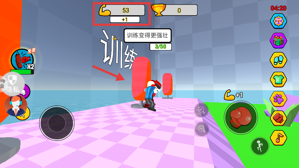 2、进入训练场景后,点击红色训练柱训练,可提升【力量-53】,完成【训练-3/50】进度。