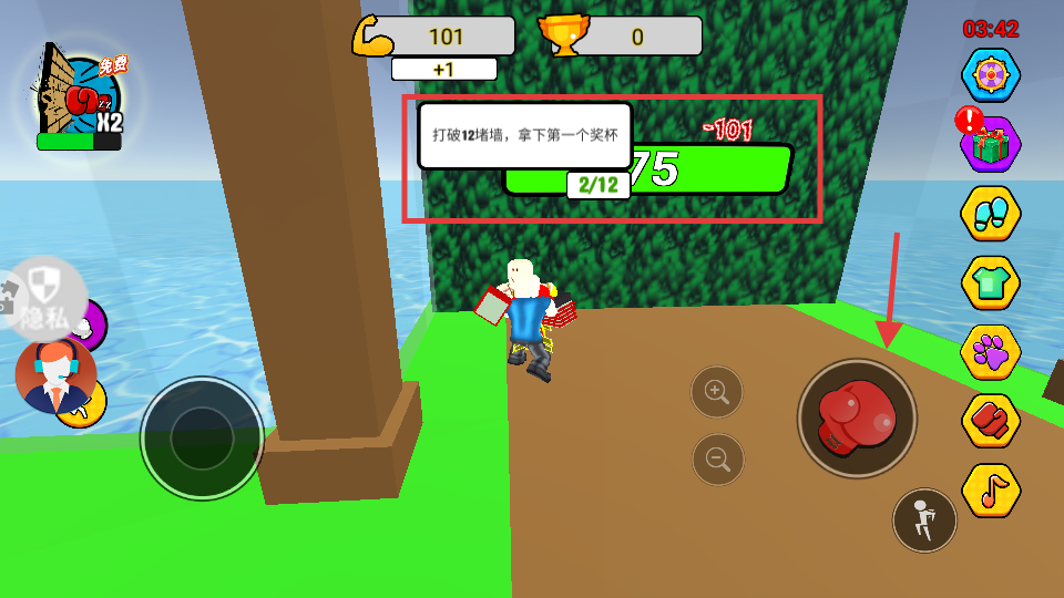 3、当【力量-101】时,点击绿色进度条的墙破坏,推进【2/12】打破墙任务拿奖杯。