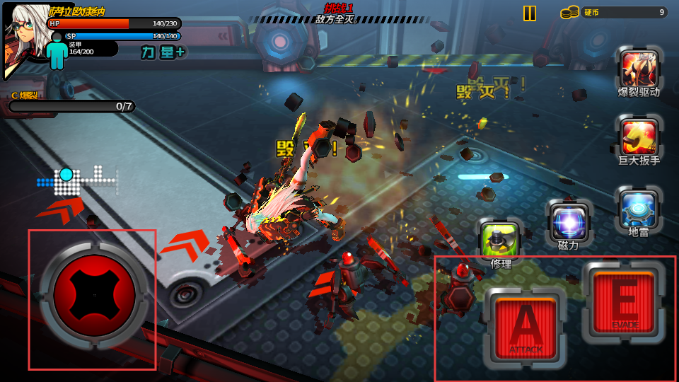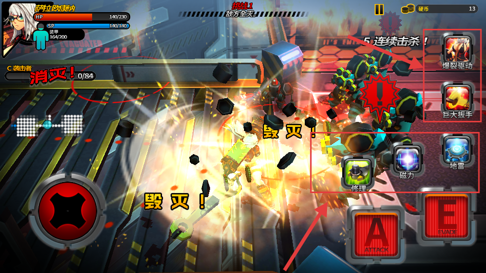 3、战斗时用左侧摇杆移动,点击右侧【A-ATTACK】攻击,适时用【E-EVADE】躲避敌人伤害。