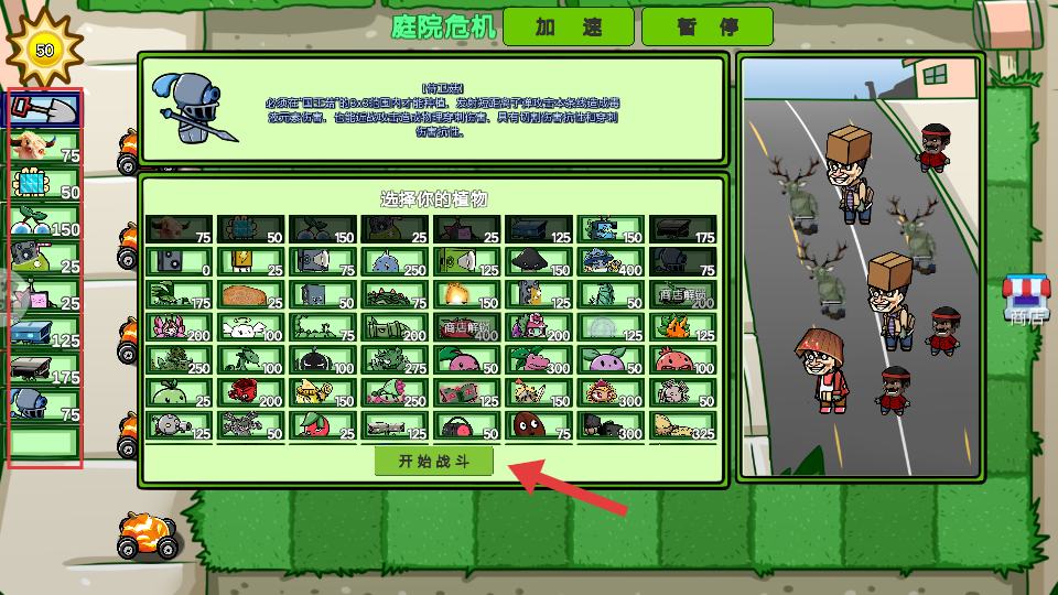 2、进入【庭院危机】关卡前,选好植物阵容后点击【开始战斗】按钮,正式对战。