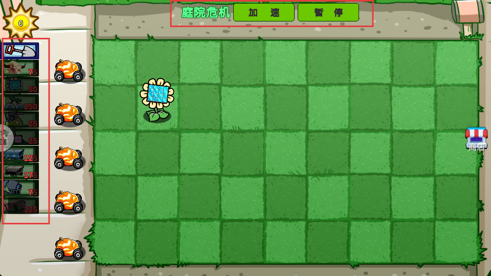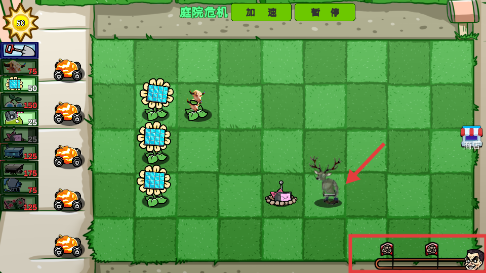 4、阳光足够后在【向日葵】右侧种防御植物,应对右方来的【小鹿-敌人】防突破。