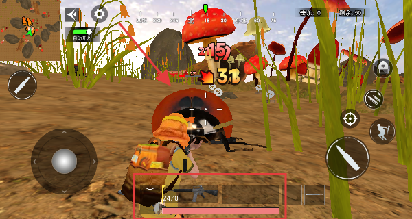 2、遇到【甲虫】敌人时用武器攻击,观察伤害【215】-【31】,留意弹药【24/0】剩余情况。