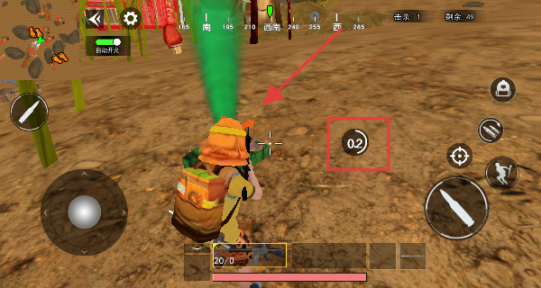 3、发现【绿色光柱】时瞄准,注意右侧【02】标记,此时弹药【20/0】需合理使用。