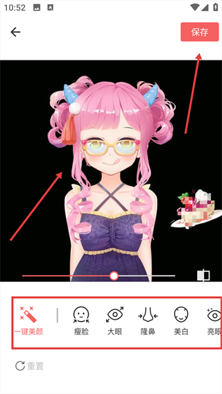3、通过【一键美颜】【瘦脸】等功能调整美化效果,完成后点击右上角【保存】按钮。