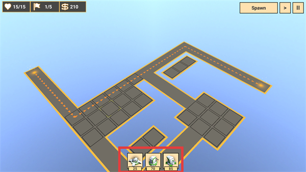 3、消耗资源选择红框内的防御塔(如25/70/35费用),部署在路径旁的格子上,构建防御阵线。