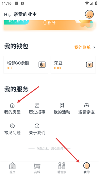 1、在“我的”页面,找到“我的服务”板块下的【我的房屋】选项。