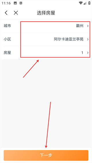 3、依次选择对应的城市、小区、房屋信息后,点击底部【下一步】按钮。