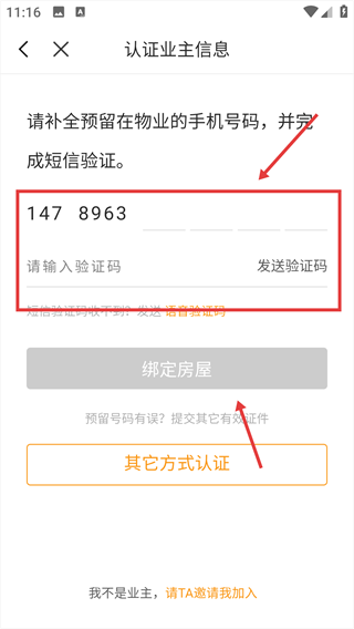 4、补全预留在物业的手机号码,点击【发送验证码】并输入收到的验证码,完成后点击【绑定房屋】即可完成房屋绑定。