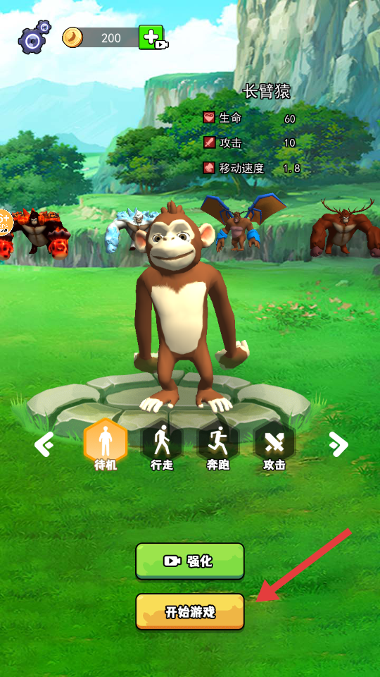 2、选择【长臂猿】角色后,可强化其【生命-60】【攻击-10】【移动速度-1.8】,再点【开始游戏】。