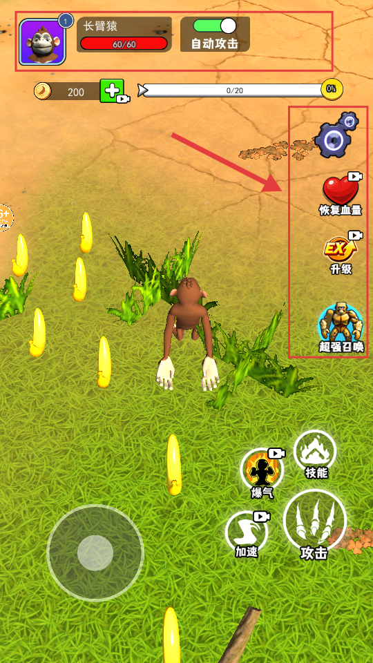 3、游戏内开启【自动攻击】,收集地上资源,右侧【恢复血量】【升级】【超强召唤】功能能解危。
