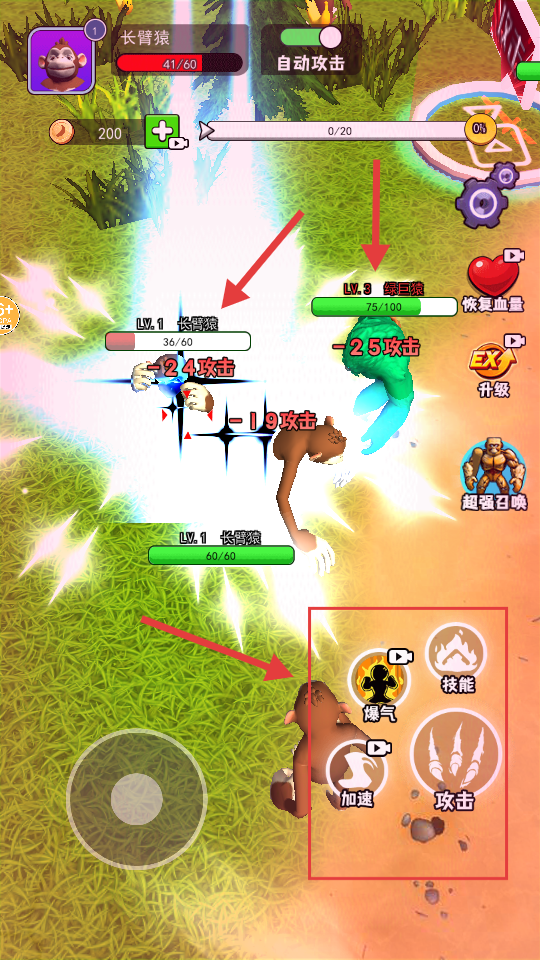 4、战斗时用【爆气】【加速】【攻击】【技能】配合,注意【长臂猿】血量,躲避敌人【-24攻击】【-19攻击】。