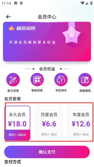 3、在会员中心选择目标套餐(如永久/月度/年度会员),选定支付方式。