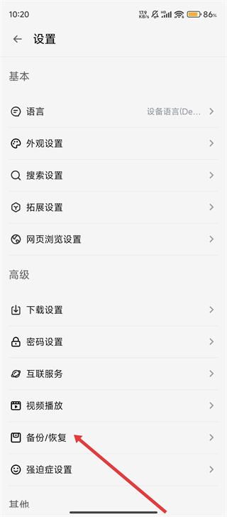 2、进入设置页,点击【备份或恢复】选项,数据备份的相关功能便一目了然啦。