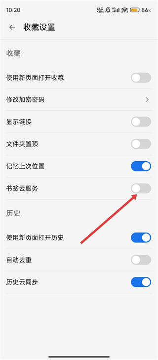 4、在收藏设置里,将【书签云服务】开关打开,书签的云备份就设置好啦,数据安全有保障哦。