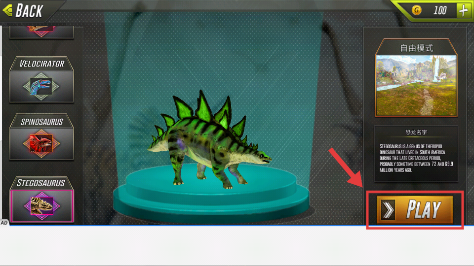 1、在恐龙选择界面选中【STEGOSAURUS】后,点击右侧红色框的【PLAY】按钮,即可进入【自由模式】开始游戏。