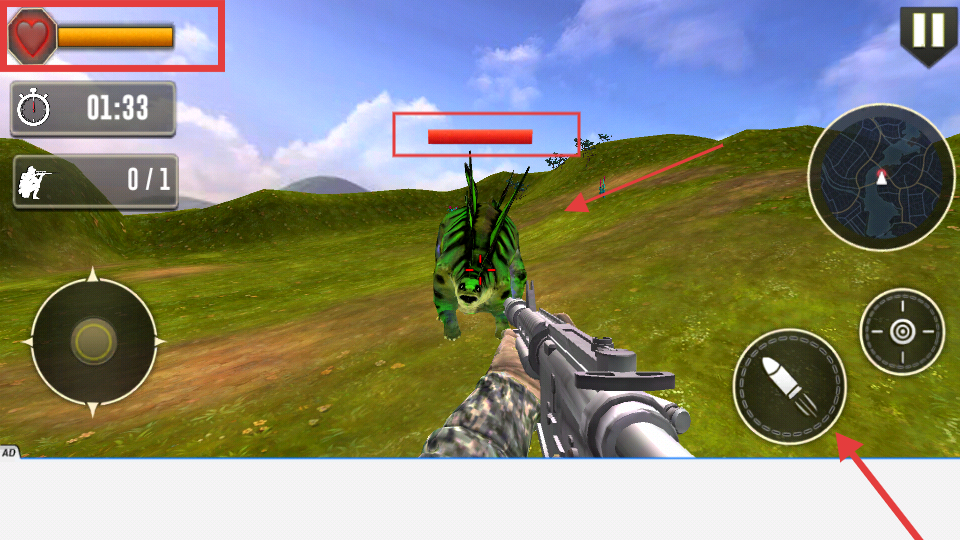 3、遇到【STEGOSAURUS】恐龙时,瞄准其头部(头顶红色血条)攻击,可使用右下角【火箭】武器快速击败。