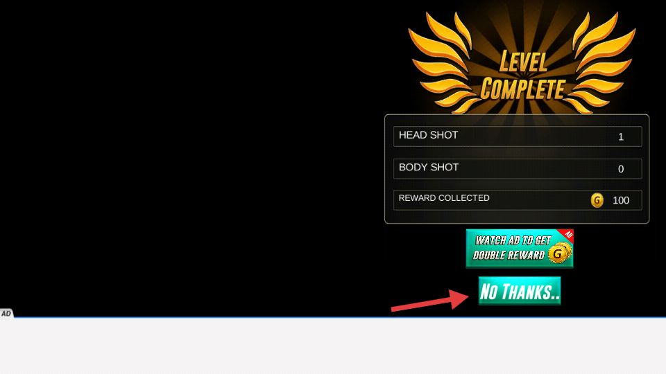4、通关后显示【LEVEL-COMPLETE】,获得【G-100】奖励,不想看广告翻倍奖励就点击【NO-THANKS..】。