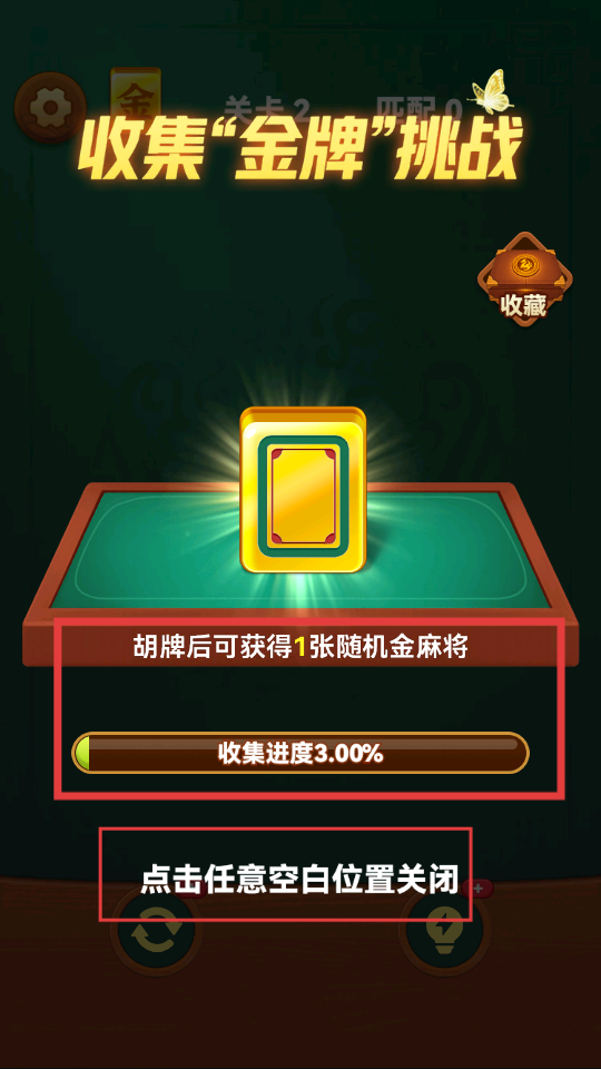 4、胡牌后会获得1张【金麻将】,积累【收集进度】,看完提示点击任意空白位置关闭弹窗。