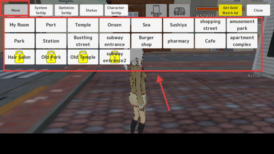 3、利用【Move】菜单的传送功能,选择【MyRoom】-【Port】等地点,快速解锁新区域。