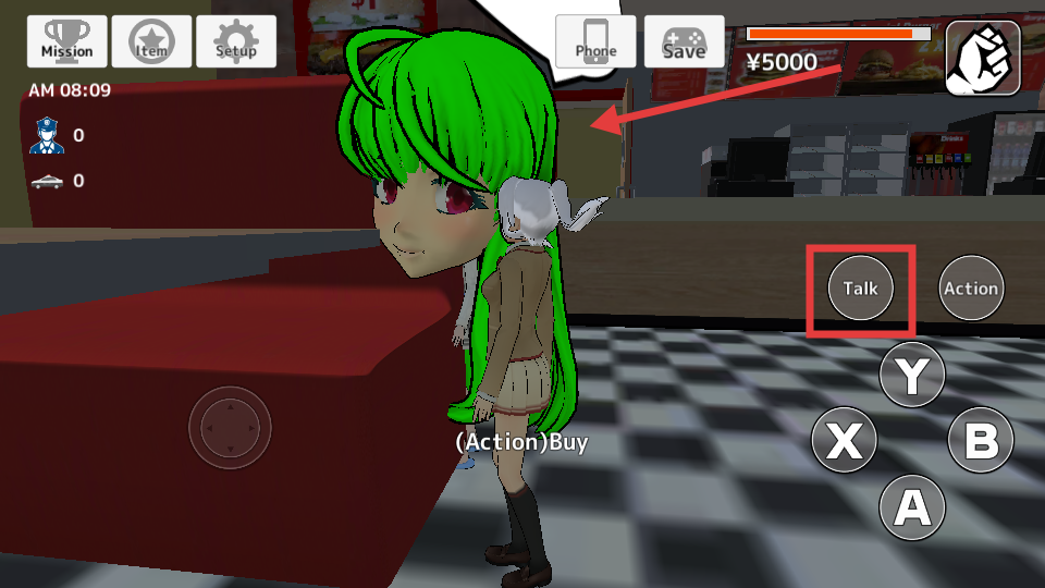 4、在店铺等场景点击【Talk】按钮,与NPC互动交友、触发剧情,也可点击【Buy】购物。