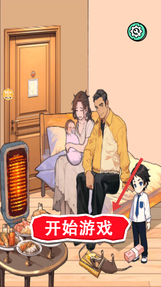 1、游戏起始界面,点击【开始游戏】按钮进入关卡,注意16+提示和家庭场景元素。