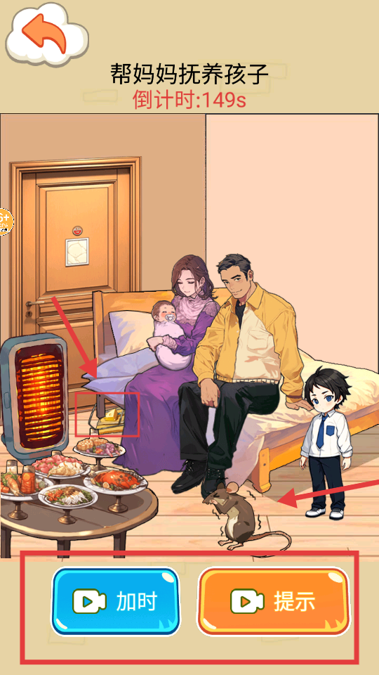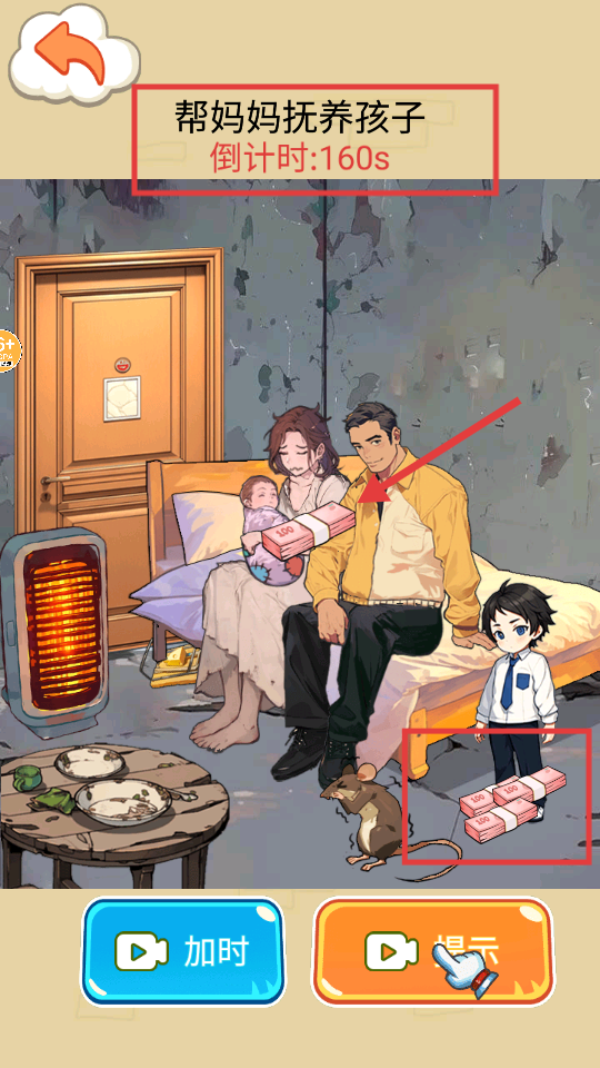 2、任务【帮妈妈抚养孩子】,倒计时【160s】,需收集场景内【粉色-纸币】避开老鼠。