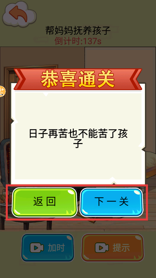 4、通关后,点【下一关】继续或【返回】主界面,关卡核心是照顾孩子。