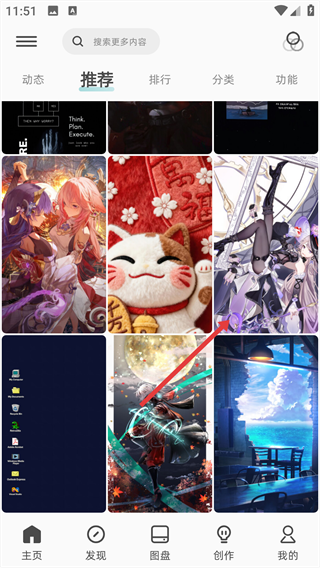 1、打开软件可以看见主页有很多精美的壁纸推荐,有动态、静态、排行、分类等等。