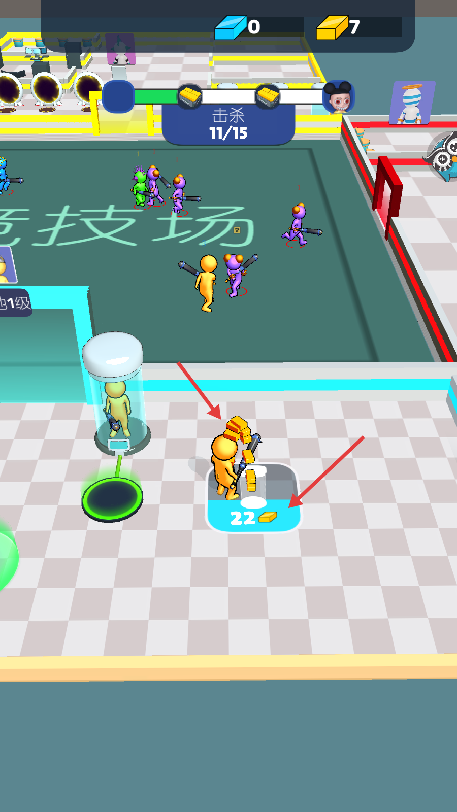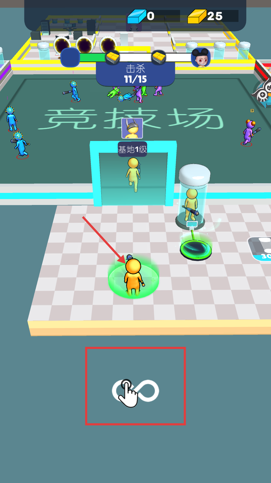 1、点击底部【∞】图标可进行相关操作,当前【击杀】进度为11/15,需在【竞技场】继续战斗。