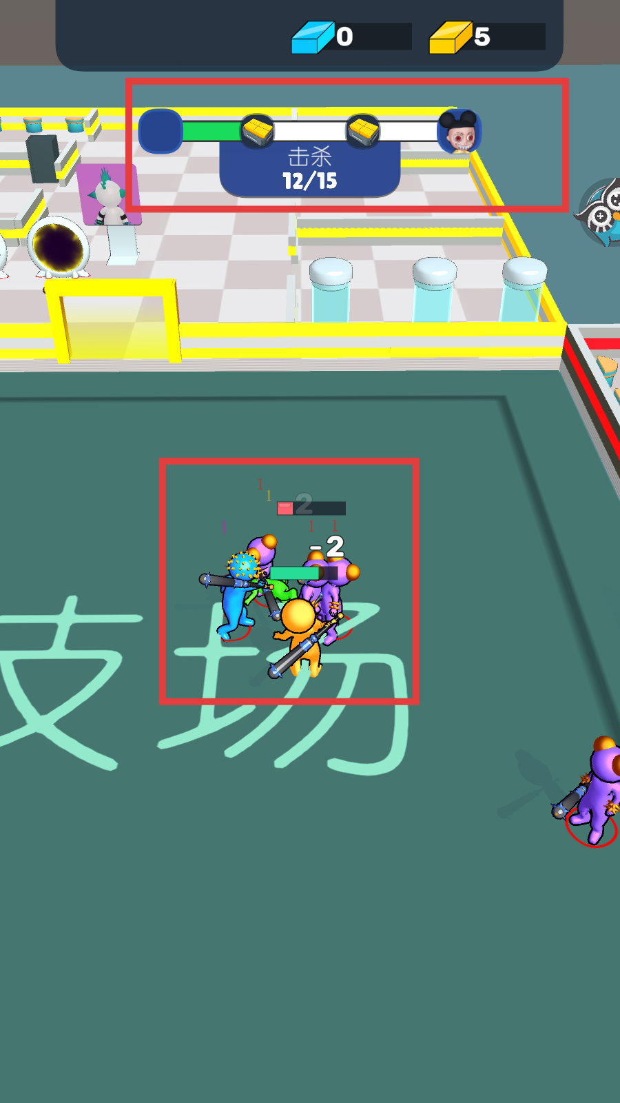 2、在【支场】区域与敌人战斗,上方【击杀】进度为12/15,注意敌人头顶的数值变化。