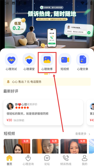 1、在首页点击【心理微博】选项,可进入心理微博专区。