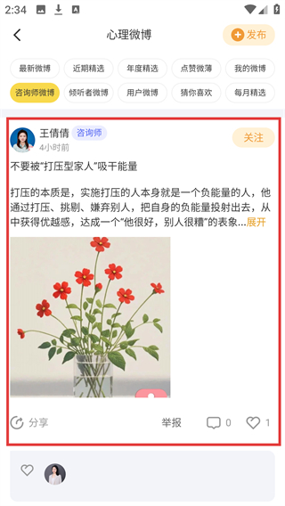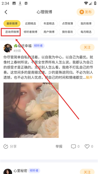 2、进入心理微博页面后,点击【咨询师微博】分类标签,即可筛选出咨询师发布的微博内容列表。