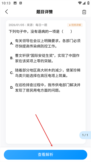 4、在题目详情页面,点击底部【查看解析】按钮,即可查看该题的解题分析内容。