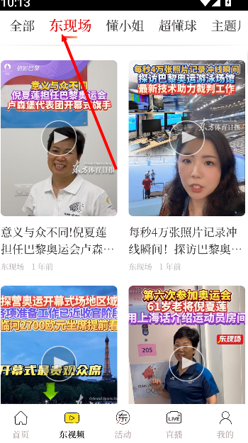 2、进入东现场视频板块,可以观看比赛实况、精彩集锦和赛事解说视频。