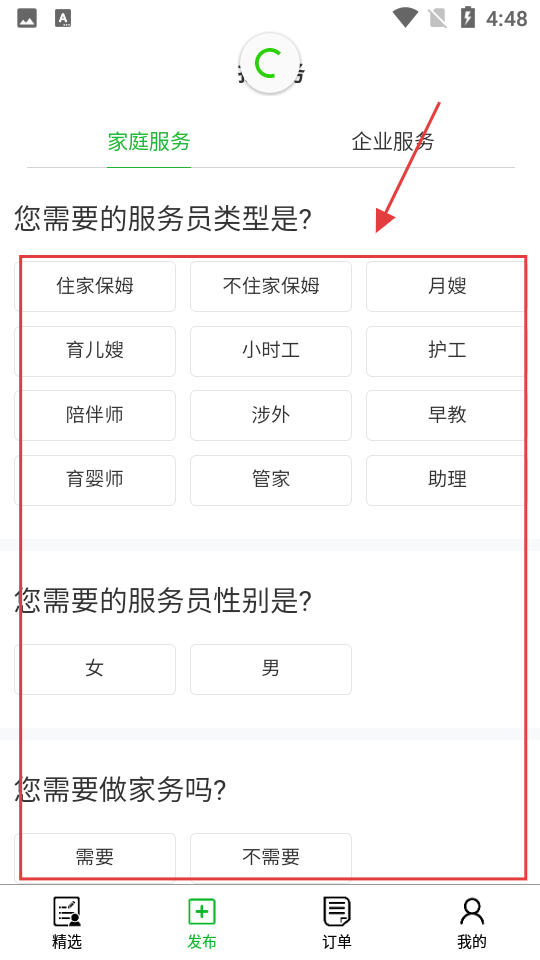 2、选择服务员类型(如住家保姆、月嫂等)、性别及家务需求。