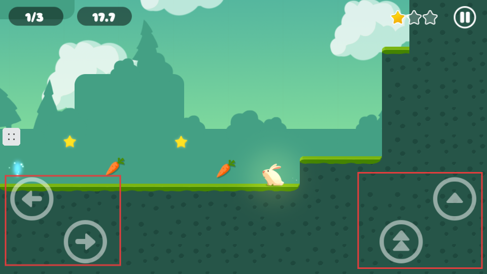 2、操控左侧【←-→】方向键移动白兔,收集道路上的【胡萝卜】和【星星】,注意避开地形缺口。