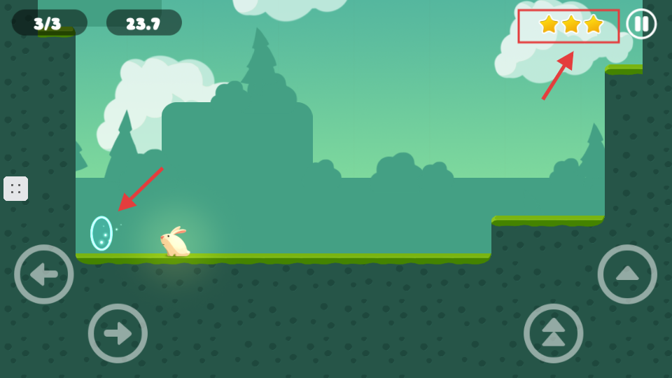 3、遇到左侧发光的蓝色圆形传送元素时触碰它,同时尽量获取满星评价。