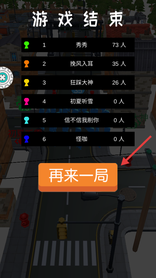 4、游戏结束后,根据排名结果点击橙色的【再来一局】按钮,可重新开启新对局。