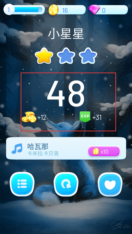 3、持续准确点击琴键,跟随音乐节奏,提升得分和星星数量。