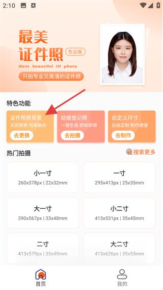 1、进入首页,点击【证件照换背景】功能,进入换背景的编辑页面。