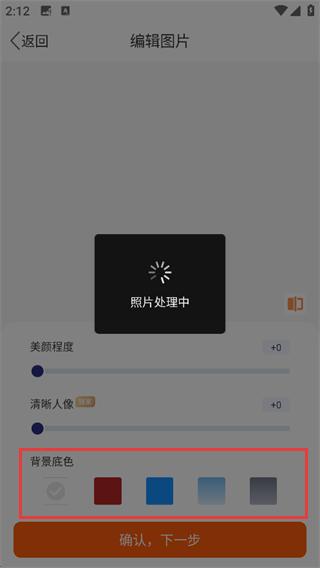 4、在处理页选择想要的背景颜色(如红、蓝等),点击【确认,下一步】完成背景更换。